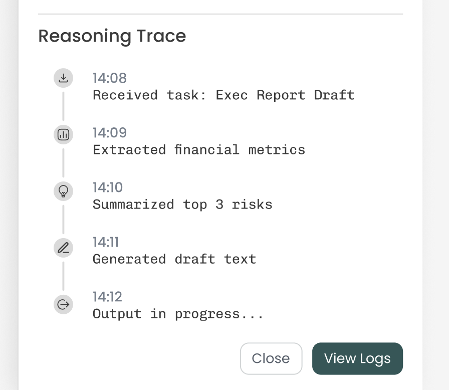 Solution: Agent outputs include reasoning traces in plain language, paired with visual confidence scales and step-based histories.